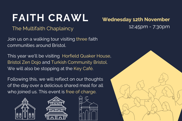 Our autumn term Faith Crawl will take place on Gloucester Road, Bristol. We will be visiting Horfield Quaker House, Bristol Zen Dojo and Turkish Community Bristol. We will also be stopping at Key Café, where we will be joined be a chaplain from Horfield prison.