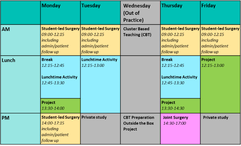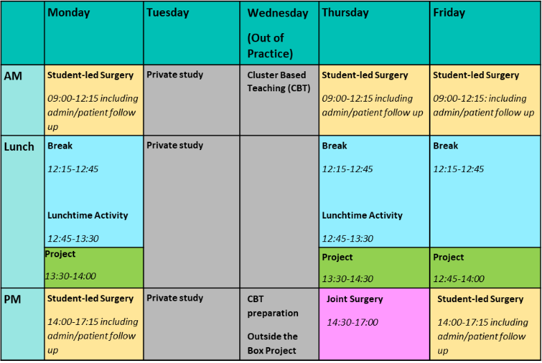 Students will come in pairs for a 9 week block. They will be out of practice every Wednesday for small group teaching. There are no prescribed teaching themes and the placement can be designed flexibly to meet the individual students’ learning needs. The students will need to be timetabled for 6 sessions in practice. This can be done flexibly over 3 or 4 days. We suggest a minimum of 5 student-led surgeries and one joint surgery each week. The students will also undertake a small project for the practice.