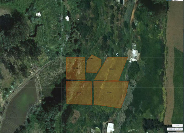 The orange zones are the GPS-located (located content) zones: walk into one of these with the app on your smartphone and the content is triggered (audio/text/images/whatever). In the last one, zone1 (lower right) is about 20x20m.