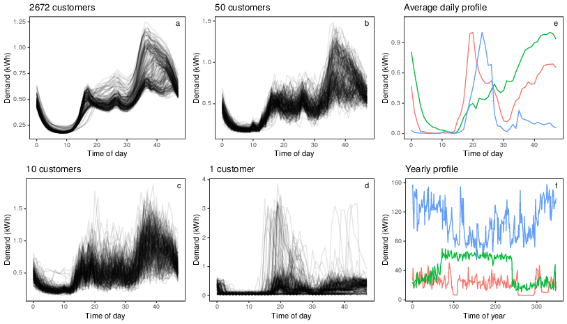 Figure 2: Plots a-d show the daily electricity demand profiles of the demand averaged over increasingly small groups of customers. Plots e and f show the average daily and yearly demand profiles of three customers. See Capezza et al. (2021) for more details.