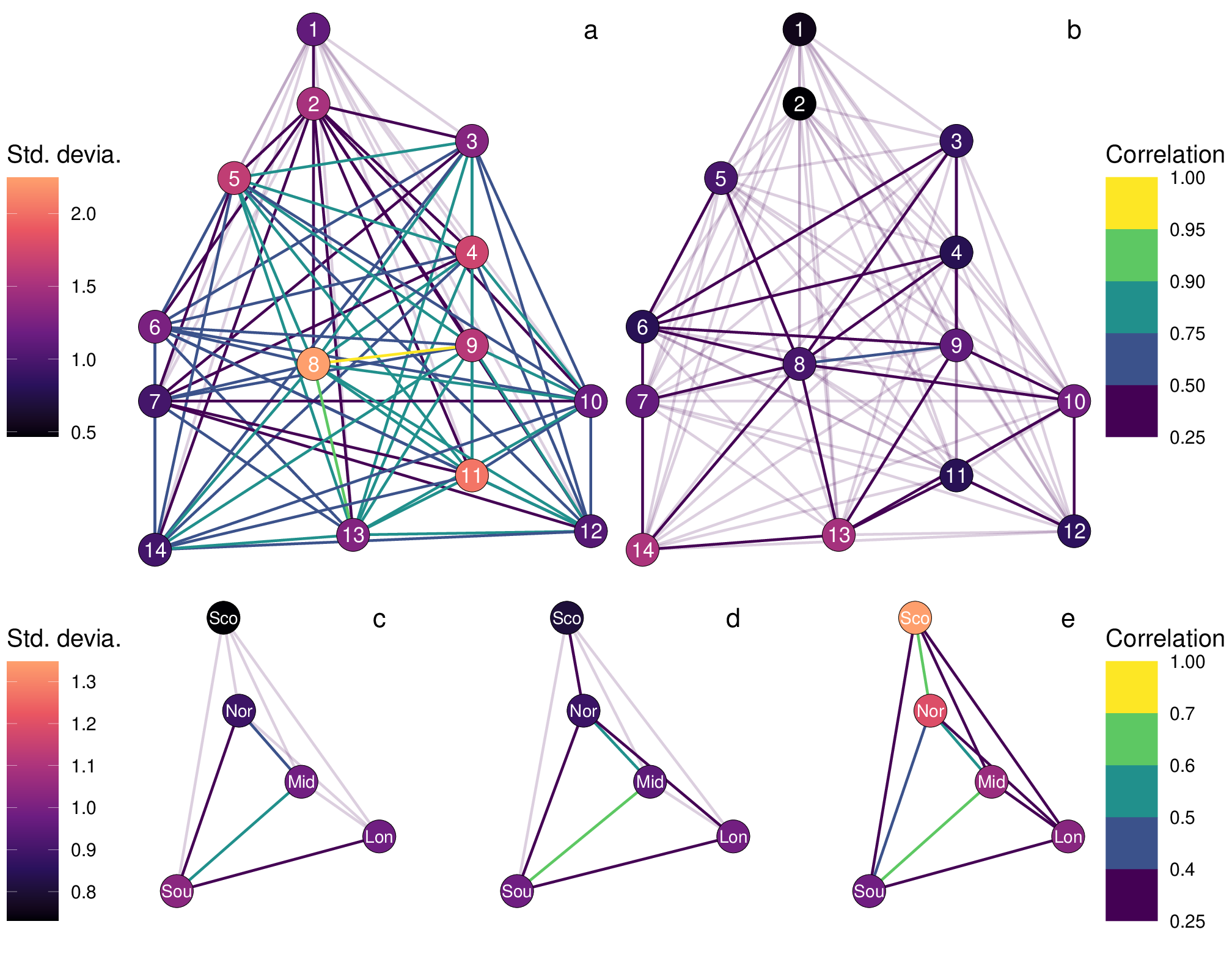 Figure 3: Variances (nodes) and correlations (edges) of electrical net-demand across the UK regions (a--b) or macro-regions (c to e), predicted by the model of Gioia et al. (2025). The plots correspond to 7am on 31/12/18 (a), midnight on 20/08/18 (b) and 10am on 14/06/18 (c to e, during storm Hector). Plot d is based on regional wind and precipitation forecasts, while c and e correspond to, respectively, a 25% decrease and increase of such forecasts.