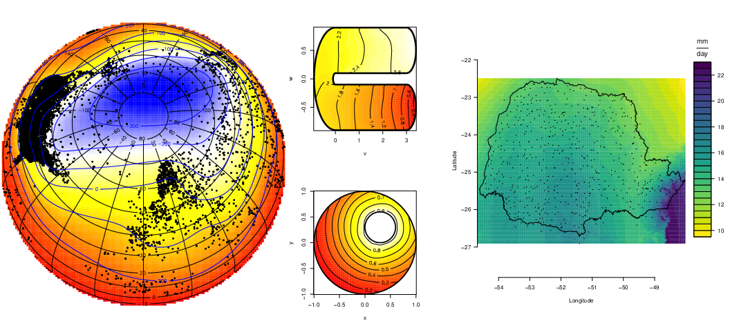 Figure 1: Example applications of the additive quantile regression models of Fasiolo et al. (2020) developed during the partnership. Left: model for minimum daily temperatures on the globe. The Gulf Stream is visible. Centre: finite-area spatial components, based on soap film smoothers. Right: quantile predictions of weekly rainfall in the Paraná state of Brazil.