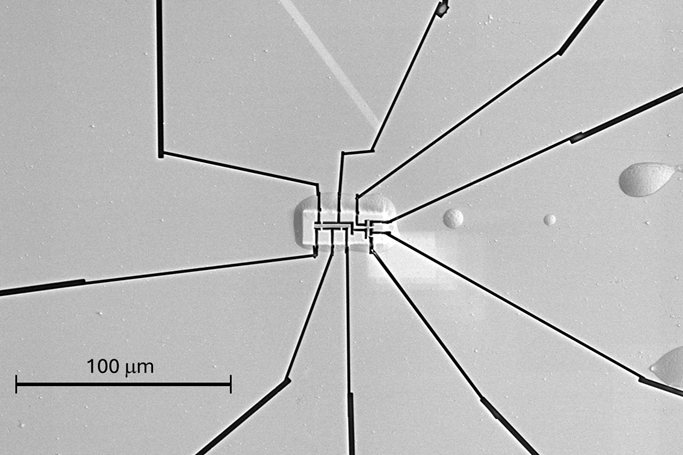 Historically, FIBs have primarily used a Ga source for the ion beam, which can give problems with Ga contamination. Recently, a new generation of Plasma FIBs (PFIBs) has been developed that have revolutionised the capabilities and versatility of this technique – we have one such system in Bristol. Remarkably, up to 60 times more material can be removed by a PFIB compared to a traditional Ga FIB in an equivalent time, allowing larger areas to be etched. The image shows an FIB etched FeSe device (centre) with Au wiring (courtesy of M. Aldis).