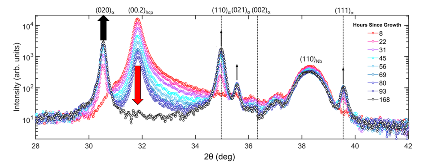 Bristol hosts a range of thin film sputtering systems, FaRMS, unique in the UK, capable of creating high quality thin films of actinide materials (U and Th: compounds, alloys and heterostructures). This opens up a wide range of fascinating directions broadly in the area of creating and controlling novel types of superconducting thin films and devices using actinide materials, from fundamental materials science and physics, to device fabrication. A recent review of the general area of thin films of uranium is here. An example of the research is the fundamental physics of elemental uranium metal, which shows charge-density wave transitions and superconductivity – both of which we can tune with epitaxial strain, and substrate templating that can even control the crystal symmetry. Recently we could stabilise the hexagonal close-packed (hcp) phase of U metal, which does not exist in nature, by using thin film buffers of Ir and Cu. However these samples were not stable over time and coherently transformed into the more standard orthorhombic form of U over several days: the image shows X-ray diffraction data of the drop in intensity (red arrow) of U-hcp peaks concomitant with growth in intensity of the U-orthorhombic peak (black arrow), showing a coherent/topotactic transition from one structure to another [adapted from Nicholls et al., Phys. Rev. Mater. 6, 103407 (2022)]. This result was unexpected, and emphasises the highly complex and fascinating materials physics of U.