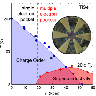My team has discovered evidence for unconventional superconductivity in TiSe2 [4]. This material is prototypical for charge order [5] which we suppress with high pressures. Interestingly, we find that superconductivity only emerges when electrons with different momenta are present indicating inter-band superconductivity likely with an unconventional mechanism for the formation of pairs of electrons from these two states. The peak in superconductivity is present when charge order is just suppressed to zero temperature indicating that the fluctuations of the charge order mediate the superconductivity. This insight contributes to the understanding of unconventional superconductivity in a range of materials.
