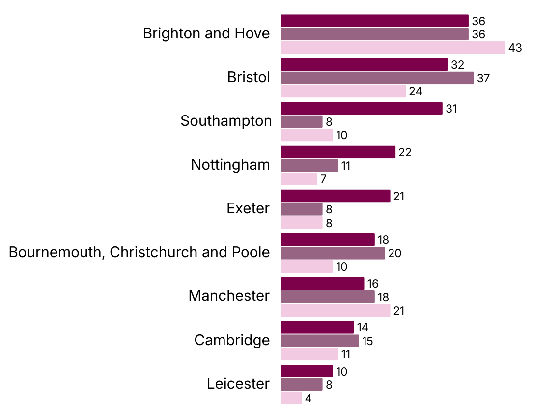 Number of reported deaths in England between 2022 and 2024 across selected Towns and Cities.