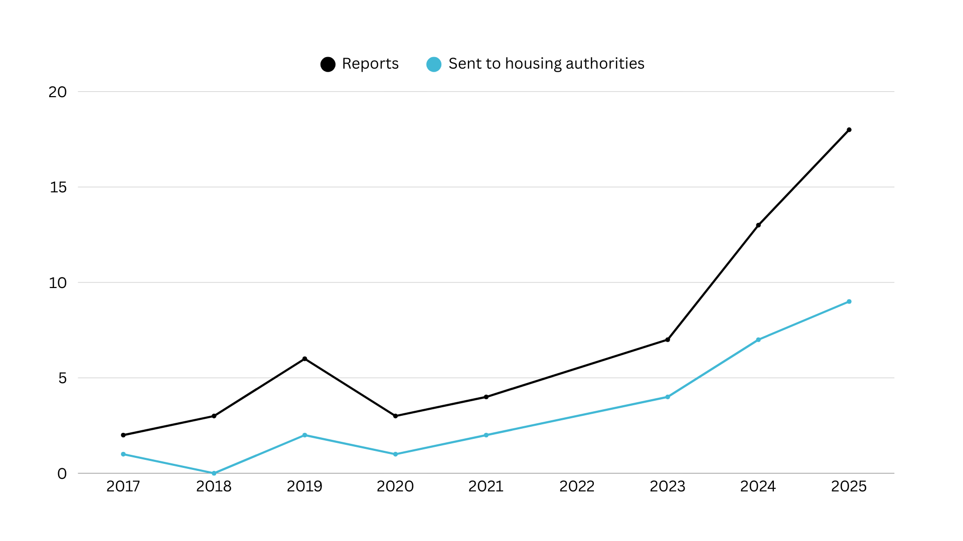 However, comparing these two periods, reports in which the person who died was homeless have increased by over 250%, going from one or two a year in 2017 and 2018 to eighteen in 2025.