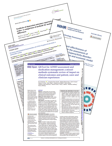 Tomlinson E, A. Owen-Smith, M. Benavente, C. Cooper, H. E. Jones, M. Ward, J. G. Walker, H. Wang, C. Lopez Manzano, D. Hank, N. J. Welton, M. Leeflang and P. Whiting (2025). "QbTest for ADHD assessment and medication management: a mixed-methods systematic review of impact on clinical outcomes and patient, carer and clinician experiences." BMJ Open 15(4): e095479.