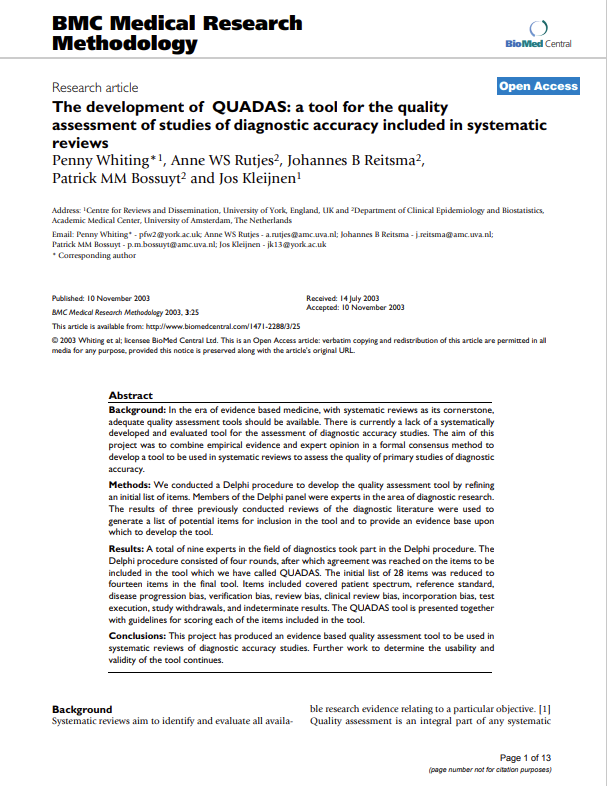 Full details of the QUADAS tool together with the background document detailing how to apply it in a systematic review were published in BioMed Central Medical Research Methodology and as an HTA report. Details of the team involved in the development of QUADAS are available in Who we are.