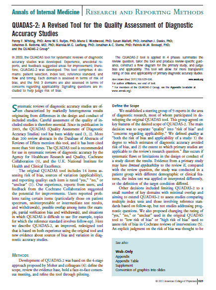 Whiting PF, Rutjes AWS, Westwood ME, Mallett S, Deeks JJ, Reitsma JB, Leeflang MM, Sterne JAC, and Bossuyt PMM. QUADAS-2: A Revised Tool for the Quality Assessment of Diagnostic Accuracy Studies. Ann Intern Med 155 (8):529-536, 2011.