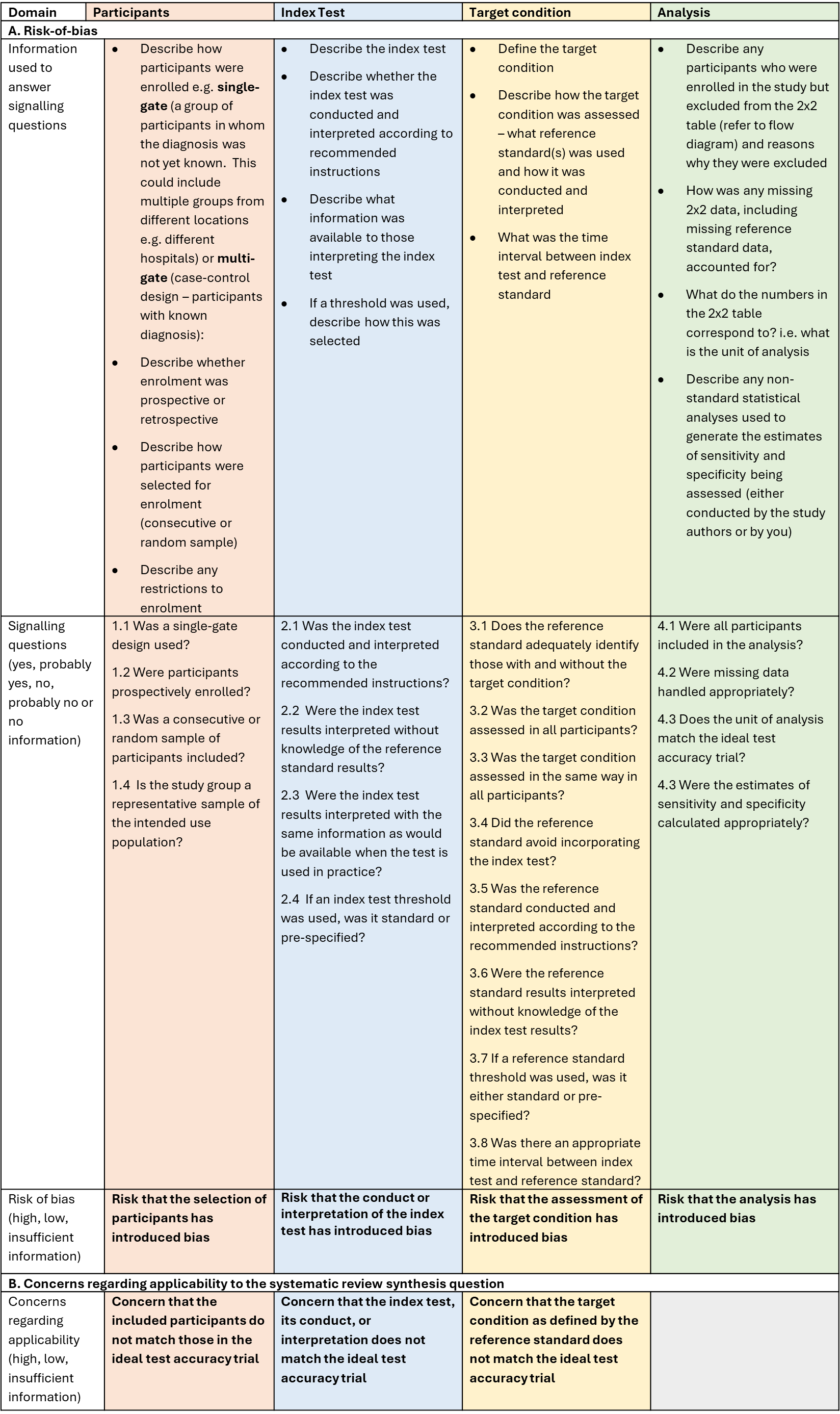 Risk of bias is assessed across 4 domains: Participants, Index test, Target condition, and Analysis. The first 3 domains are also assessed in terms of concerns regarding applicability to the synthesis question. Signaling questions are included to help judge risk of bias. The Table below provides a summary of the full Phase 5 components of the tool.