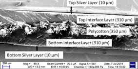 The textile antenna shown to the right was fabricated using screen printing. This technology is low cost, simple and suitable for patch fabrication. The fabric substrate is PES/cotton (65/35) which is widely used in the garment industry. As the fabric surface is rough and not suitable for direct deposition of conductive layers, an interface layer using UV-curable ink was printed onto the fabric surface, to reduce surface roughness.