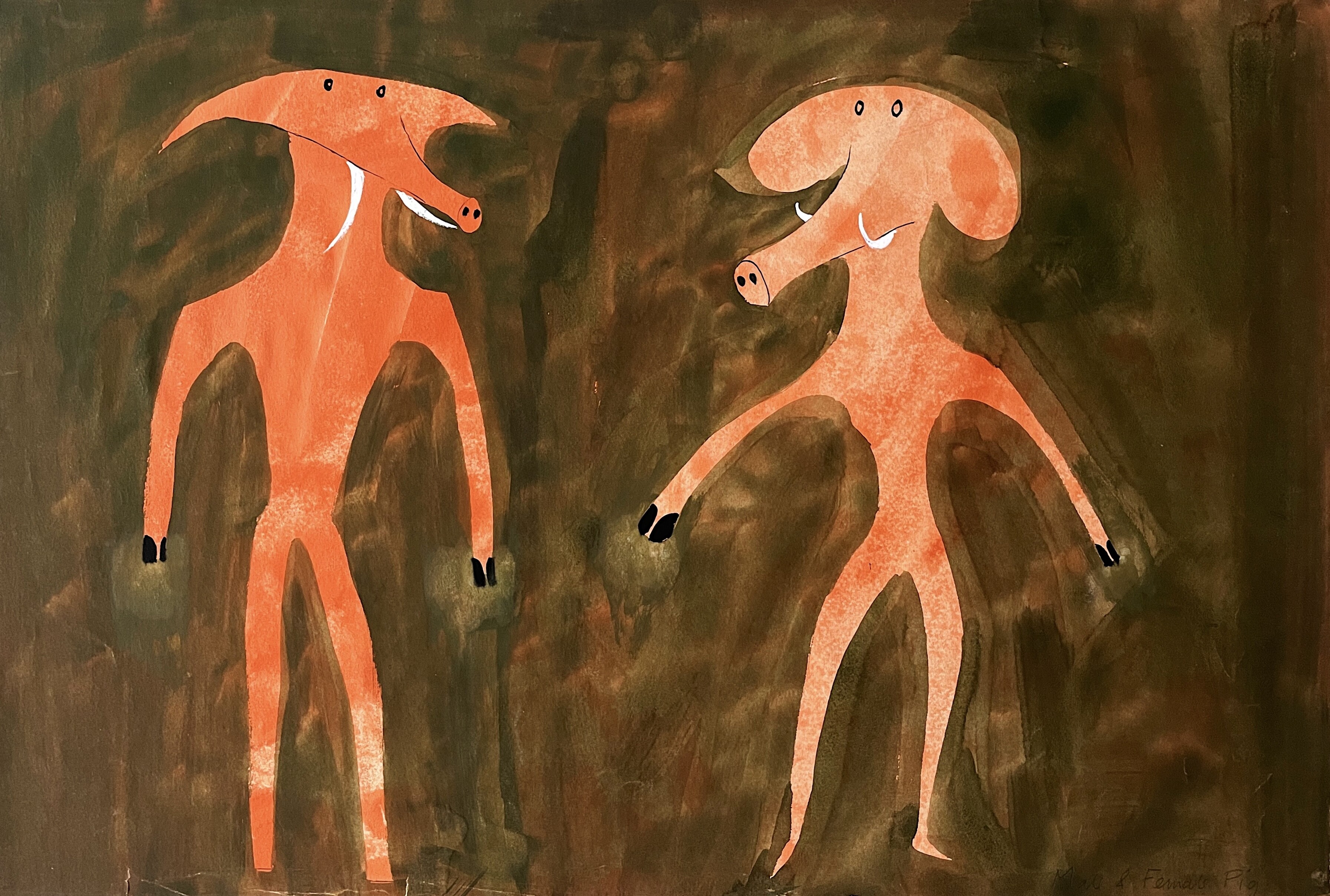 In addition to theatre, Adron collaborated widely in interior and graphic design, often working with his lifelong partner, architect and designer Max Clendinning. Their homes in London and Umbria were celebrated for their originality, and their collaborations featured in exhibitions at the V&A and Ulster Museum. Adron also taught at several art schools, including Croydon College of Art, and in later years focused increasingly on painting, exhibiting at the New English Art Club and other venues. In later years Ralph largely focused on painting, sometimes completing three or four gouaches a day. These retained a highly theatrical element, some of them triptychs, depicting strange, exotic figures in intriguing landscapes.