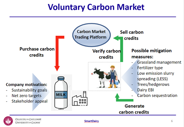 A carbon credit market is a market where carbon credits, created by farmers would be sold to buyers, most likely companies, helping to reduce GHG emissions in the dairy sector. Farmers would generate these credits by taking up climate smart innovations and practices such as clover and improved grassland management, planting trees and managing hedge rows, and other practices found to reduce GHG emissions. These practices and innovations would then be evaluated by a third party to calculate the level of carbon emissions taken out of the atmosphere or prevented from entering the atmosphere all together. This evaluation would then equate to a corresponding level of carbon ‘credits’ that have been created by the farmer which they can trade and sell. These credits would be traded on a platform where buyers like food processing and producing companies can purchase them.