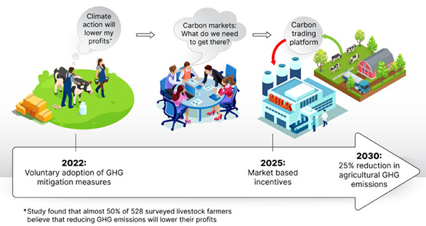 Based on the dairy stakeholder input, the next step is to test the carbon market. This will be done with living labs where dairy farmers implement carbon mitigation practices and then are matched to industry buying partners who will pay them for their implementation. Check in later to see our experience from that.