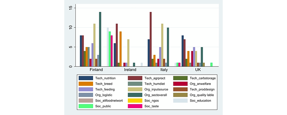 Shown in the table below, innovation typologies show significant differences country wise. In Finland overall dairy sector re-organization was mentioned more, focusing on food waste reduction and intensification/optimization of land use for dairy production, followed by input source substitution, dealing with closed energy and resource cycles i.e. on-farm biogas, and local forage production. Ireland, UK and Italy share a focus on technological innovations connected to farm management techniques, including efficient distribution of fertilizers and soil management. Like Finland, the organizational innovation potential in the Italian dairy sector was frequently mentioned, such as in re-thinking the use of inputs and outputs of the dairy supply chain e.g. manure utilization for energy production. The Irish sector’s attention was turned to technological innovation instead, ranging from increased use of local breeds to selective breeding for increased efficiency. UK responses focused on improvement in the feeding systems.