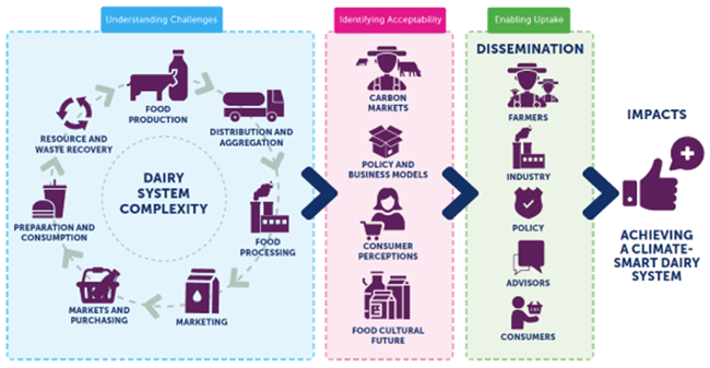 Food systems are responsible for one third of global greenhouse gas (GHG) emissions. Dairy production is a significant contributor to those emissions and, given that global demand for dairy is projected to increase, there is an urgent need to reduce emissions from this sector. For example, a clearer understanding of the functioning and acceptability of climate-smart innovations that can be implemented along the dairy supply chain can contribute to achieving a climate-neutral EU continent by 2050.