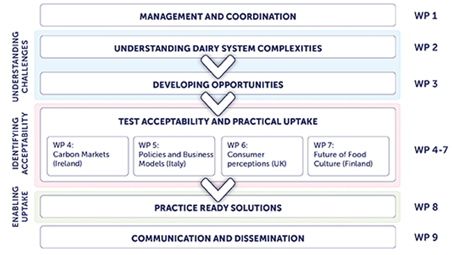 Country specific outcomes will be consolidated during the final stage of the project. Here, we plan to present findings from all countries to local stakeholders for creation of solutions that enable a climate-smart dairy system that is acceptable to all actors from farm to fork. An overview of the project structure and the work packages (WPs) is provided in the figure below.